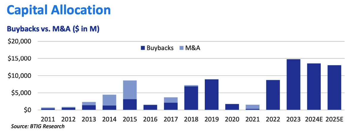 Un informe de investigación reciente de BTIG señala que los acuerdos de fusiones y adquisiciones se han vuelto menos frecuentes y menos relevantes en este sector, y predice que esta tendencia continuará en 2025. En lugar de buscar grandes adquisiciones, estas empresas están priorizando la utilización de su capital en programas de recompra de acciones, lo que sugiere una estrategia de crecimiento más conservadora y estable.