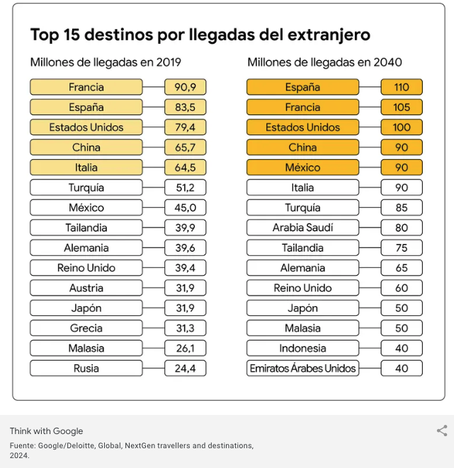 El análisis proyecta que España podría desbancar a Francia como el país más visitado del mundo en 2040, aunque ambos destinos se mantienen en una cerrada competencia. Otro dato revelador es la irrupción de México en el top cinco de destinos globales, lo que subraya la diversificación geográfica del turismo internacional.