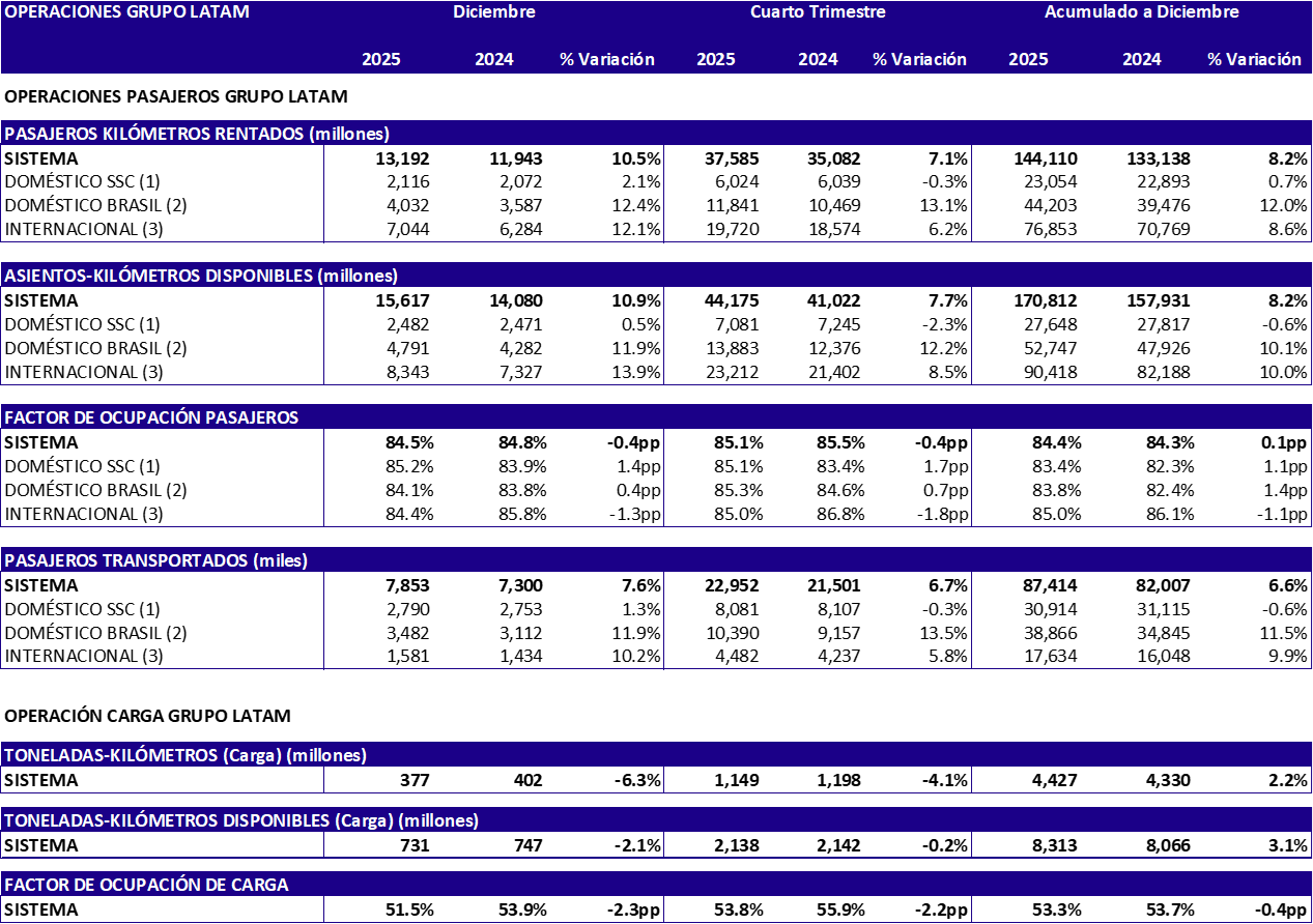 Por su parte, el tráfico consolidado, medido en pasajeros-kilómetros rentados (RPK), aumentó 10,5% en comparación con diciembre de 2024. Como resultado, el factor de ocupación consolidado del grupo LATAM alcanzó 84,5% durante el mes.