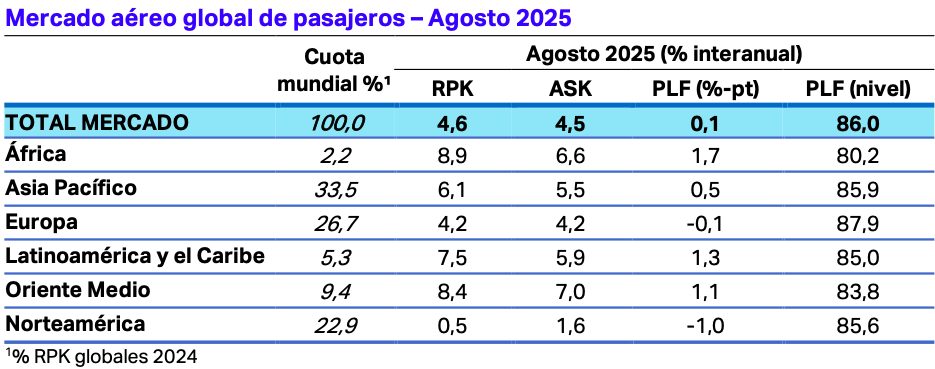 La Asociación de Transporte Aéreo Internacional (IATA, por sus siglas en inglés) ha publicado los resultados del transporte aéreo mundial de pasajeros correspondiente a agosto de 2025, entre los que destacan los siguientes datos: