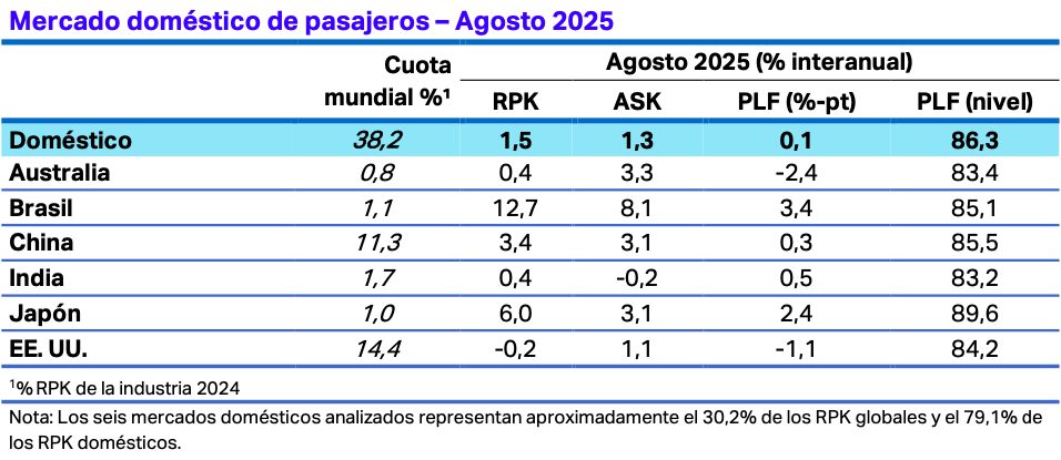 - La demanda doméstica aumentó un 1,5% interanual en agosto de 2025. La capacidad se expandió un 1,3% interanual. El factor de ocupación se situó en el 86,3% (+0,1 p.p. interanual).