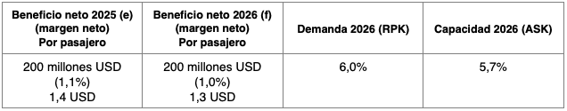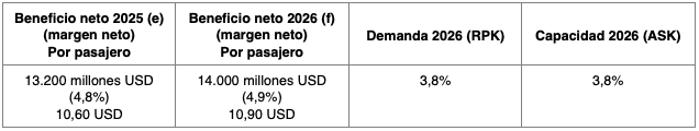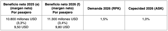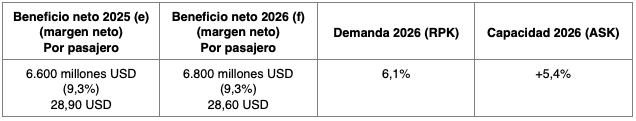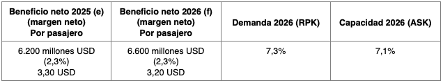 - Se prevé un beneficio neto de 41.000 millones USD en 2026, una mejora respecto a los 39.500 millones USD previstos en 2025. Si bien el dato representa un máximo histórico, el margen de beneficio neto se mantiene sin cambios respecto a 2025 (3,9%). El beneficio neto por pasajero transportado se sitúa en 7,90 USD (por debajo del máximo de 8,50 USD alcanzado en 2023, y sin cambios respecto a 2025).