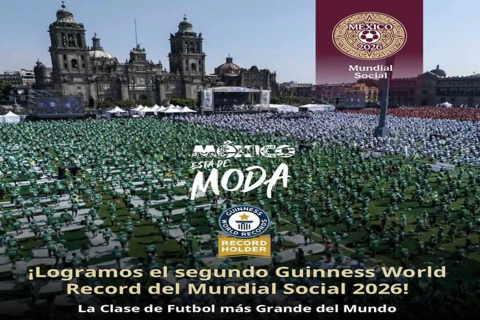 Como parte de las acciones del Mundial Social rumbo a la Copa Mundial de la FIFA 2026, la Secretaría de Turismo del Gobierno de México y el Gobierno de la Ciudad de México anunciaron que este domingo se rompió el Récord Guinness de “La clase de futbol más grande del mundo”, realizada en el Zócalo capitalino, en la que participaron 9 mil 500 personas.